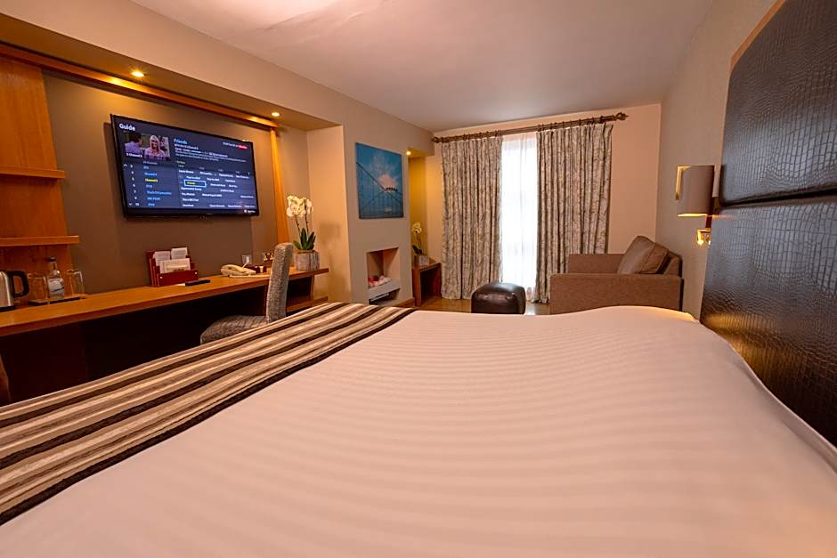 Deluxe rooms are designed with a contemporary lounge and fireplace where you can relax. The rooms contain a TV, DVD player, laptop size safe (up to 14" laptops), tea and coffee making facilities and a comfortable bed with modern fabrics by Designers Guild. Deluxe rooms are more spacious than standard rooms and offer a even higher standard of finish. The high standards are maintained throughout with upgraded bathrooms containing power shower over bath and toiletries.